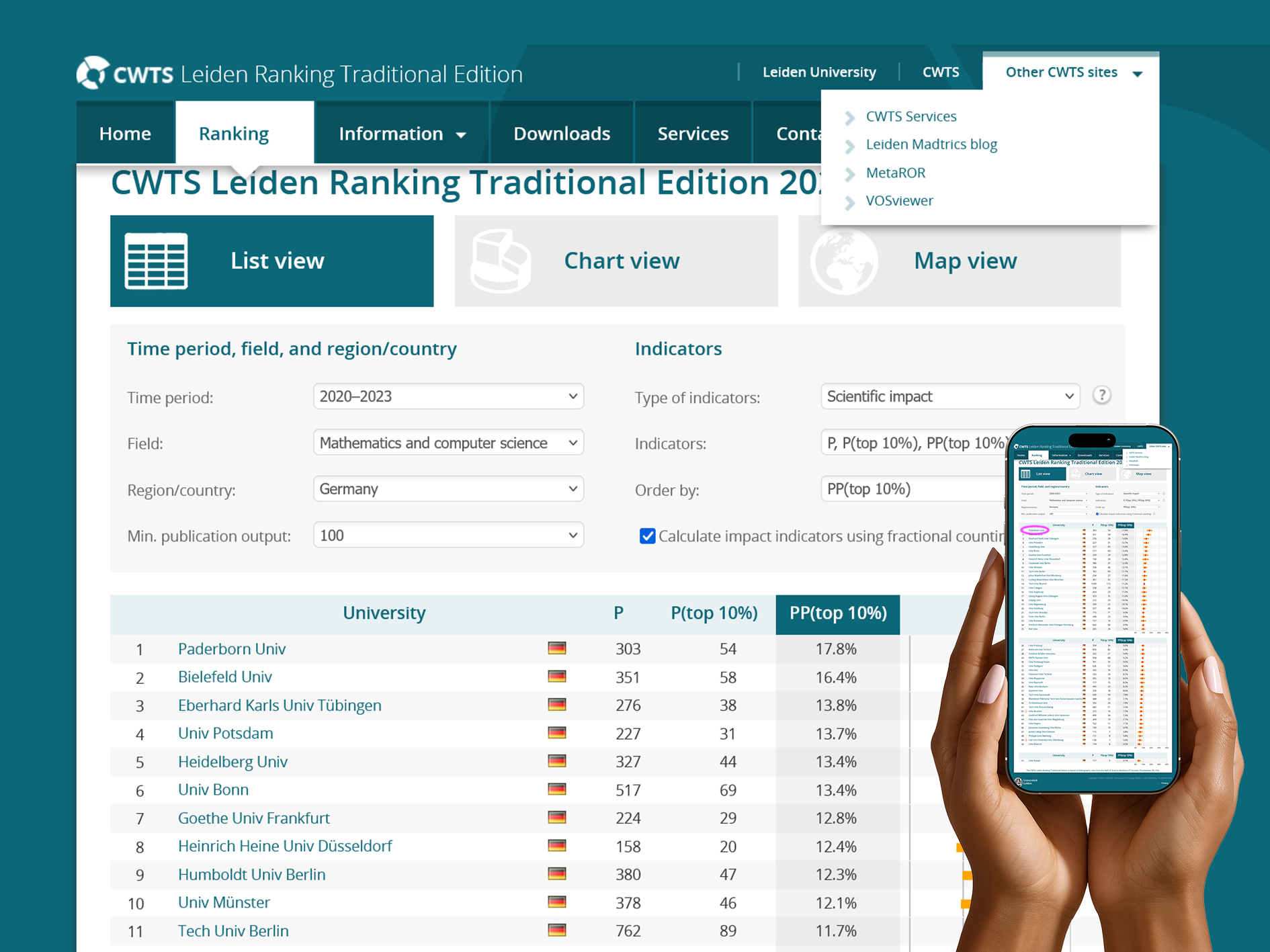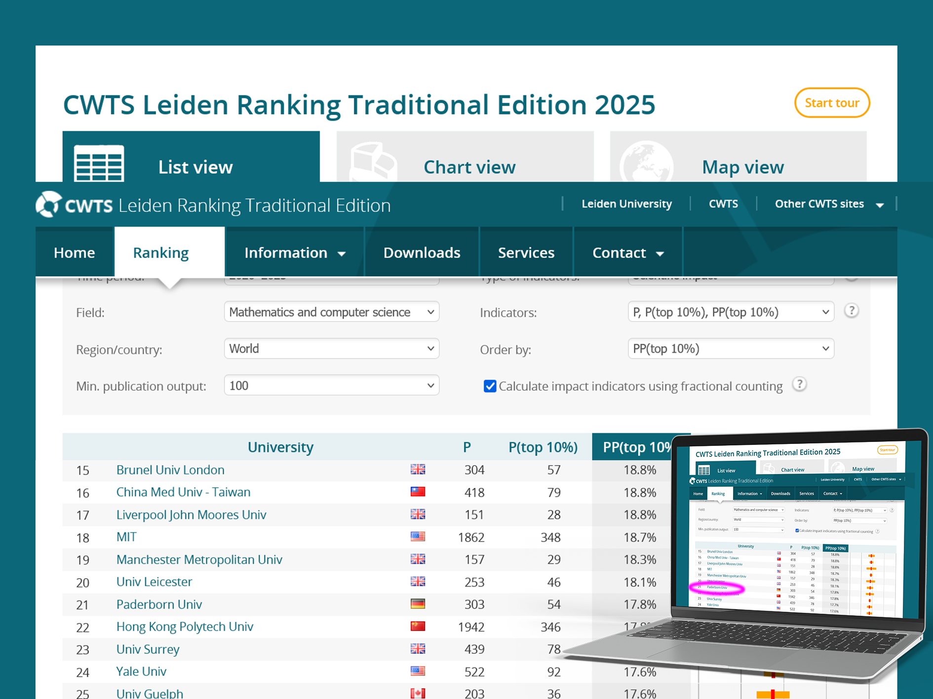 The Paderborn University achieved outstanding results in the field of mathematics and computer science, ranking 1st nationally and 21st worldwide in terms of the proportion of highly cited research publications for the period 2020 to 2023 in the “Traditional Edition” (https://traditional.leidenranking.com/ ) of the renowned CWTS Leiden Ranking.