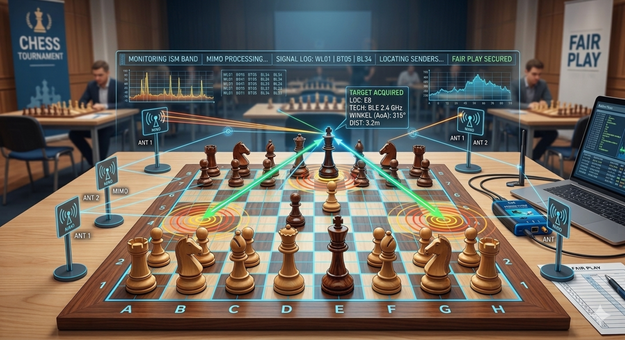 Die Identifikation nicht-autorisierter Kommunikation ist eine wachsende Herausforderung. Die enorme Signaldichte und die technologische Vielfalt moderner Funkprotokolle wie BLE, LTE und 5G erschweren die herkömmliche Überwachung massiv. Besonders in Umgebungen mit höchsten Integritätsanforderungen – wie etwa der Unterbindung von Betrugsversuchen bei professionellen Schachwettbewerben – müssen selbst schwache, transiente Signale in stark vorbelasteten Spektren isoliert werden.