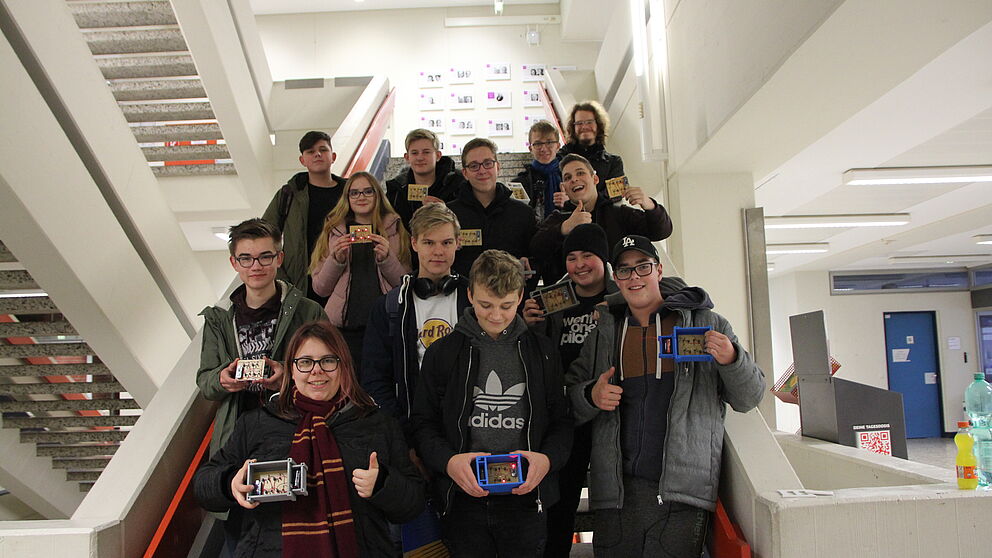 Der Staatssekretär Klaus Kaiser zu Besuch im Schülerlabor coolMINT (v.l. Christian Berg (HNF), Prof. Katrin Temmen (Universität Paderborn), Klaus Kaiser (MKW NRW), Edmond Thevapalan (Schülerlabor coolMINT), Dorothee Indlekofer (Schülerlabor coolMINT), Uwe Schoop (zdi FIT.paderborn), Dennis Fischer, Mostafa Afshar, Johannes Schäfers (Schülerlabor coolMINT))(Quelle:zdi)